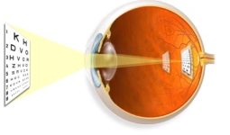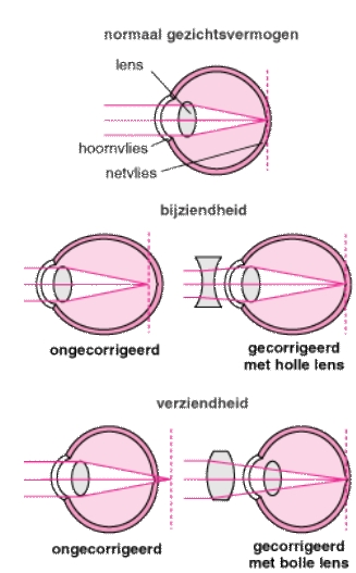 Wanneer het hoornvlies te bol is of het oog te lang dan worden de binnenvallende stralen te sterk gebroken. Ze vallen dan samen op een punt dat vóór het netvlies ligt. Op het netvlies zelf ontstaat geen scherp beeld; men spreekt dan van bijziendheid. Bij bijziendheid kan men zonder bril dichtbij goed zien, maar veraf niet. - Verziendheid